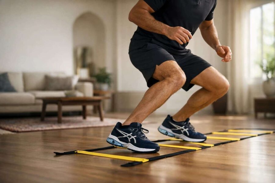 - استفاده نکردن از کفش ورزشی مناسب: تمرین چابکی در خانه روی فرش یا سرامیک با پای برهنه یا جوراب بسیار خطرناک است. برای جلوگیری از لیز خوردن و همچنین جذب ضربههای ناشی از پرش، حتماً از کفشهای ترینینگ یا کفش رانینگ استاندارد در داخل خانه استفاده کنید.